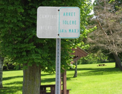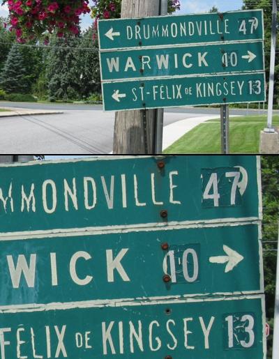 Rang Saint-Mathieu, Shawinigan (Shawinigan-Sud). Le long de la piste de ski de fond, sous le pont de la Route 351, Shawinigan. Rue Cardinal-Maurice-Roy, Québec. Dans le village de Kingsey Falls, vieux panneaux sur lesquels on peut apercevoir les distances en miles qui ont été masquées lors de la conversion au système métrique. 47 km = 29 miles / 10 km = 6 miles / 13 km = 8 miles Rue Principale, Saint-Mathieu-du-Parc. Trop d'explications c'est comme pas assez ! Autoroute 55 nord, Halte routière de Stanstead. Camping interdit / Arrêt toléré SVP ne restez pas trop longtemps !! |
